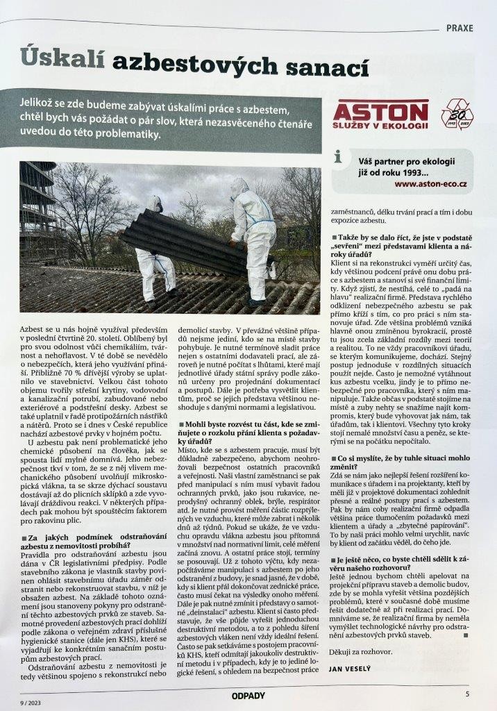 V zářijovém vydání časopisu ODPADY najdete článek, který se věnuje odstraňování materiálů s azbestem a autoři jsou naši zaměstnanci, kteří se této problematice věnují.